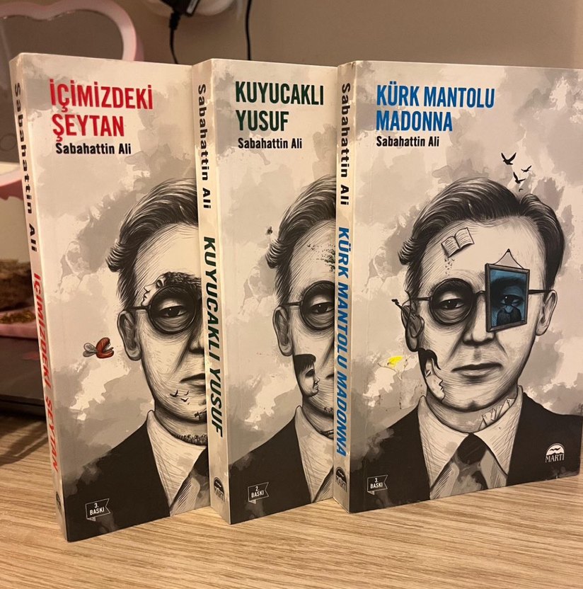 Sabahattin Ali'nin "Kürk Mantolu Madonna," "Kuyucaklı Yusuf" ve "MiZdeki Ytan" adlı romanlarından oluşan üç kitaplık set. Kitap kapaklarında karakter portreleri yer alıyor.
