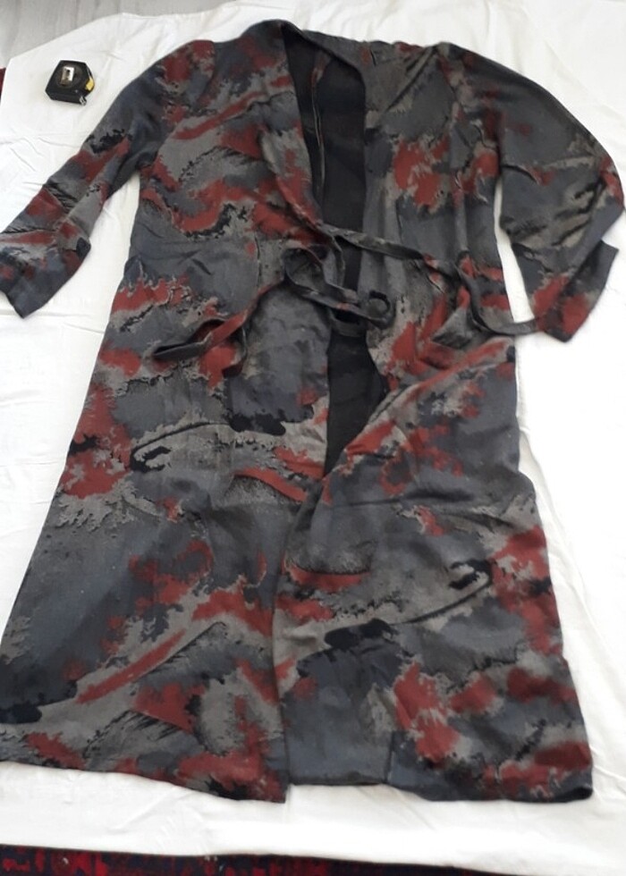 Kışlık kumaş sabahlık. Marka ve beden etiketi yoktur. İki kol altı arası 56,5 cm, boyu 119 cm. Kusuru yoktur.