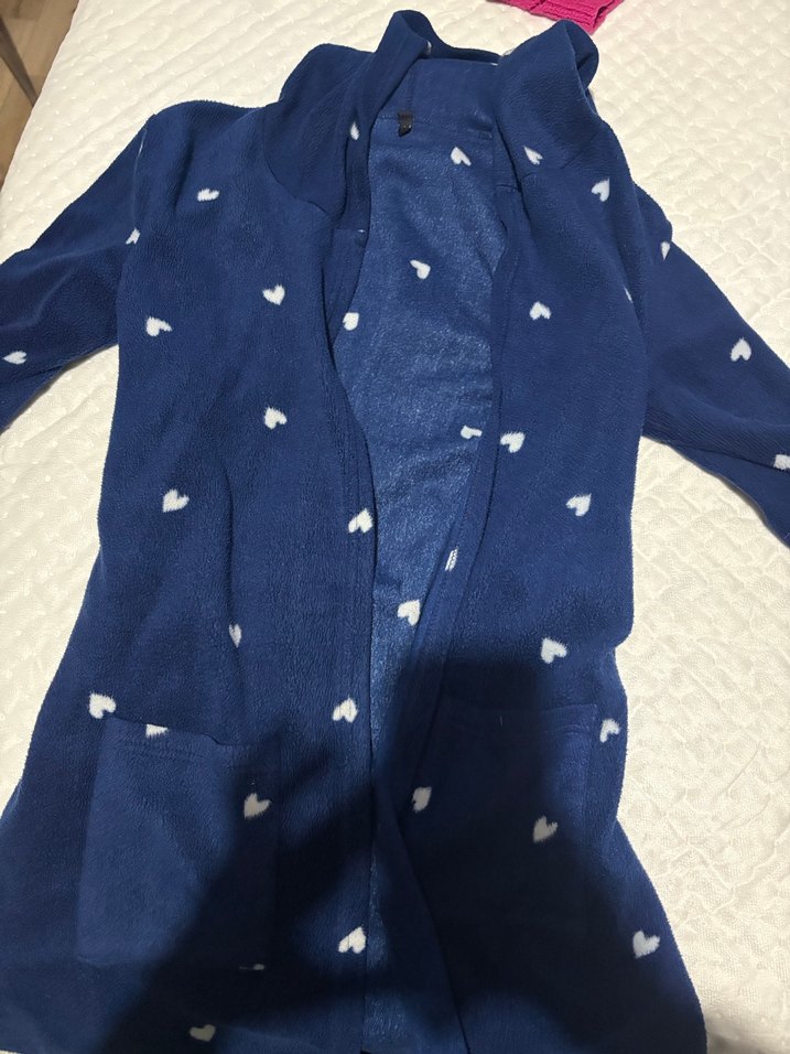 Koyu mavi renkte, uzun kollu ve midi boyda, bol kesim rahat bir bornoz. Küçük beyaz kalp desenleriyle süslenmiştir. Rahatlama için uygundur.