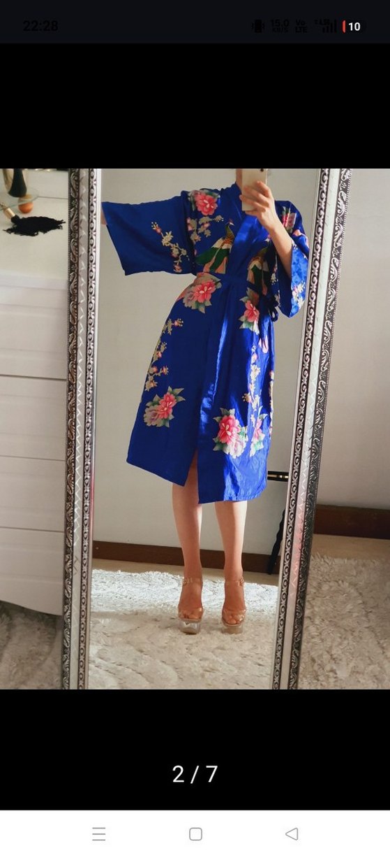 Çiçek desenli, mavi, ipeksi kumaştan, bol kesim midi boy bohem kimono. Drapeli ve askılı kollu, günlük kullanım için uygun.