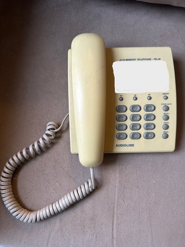 Bej renkte, hafıza tuşlu ve spiral kablolu sabit telefon. Çalışır durumda, bir sorunu yok, ev telefonu, ofis telefonu, 10 adet hızlı arama kapasiteli Model: Audioline. ☎️