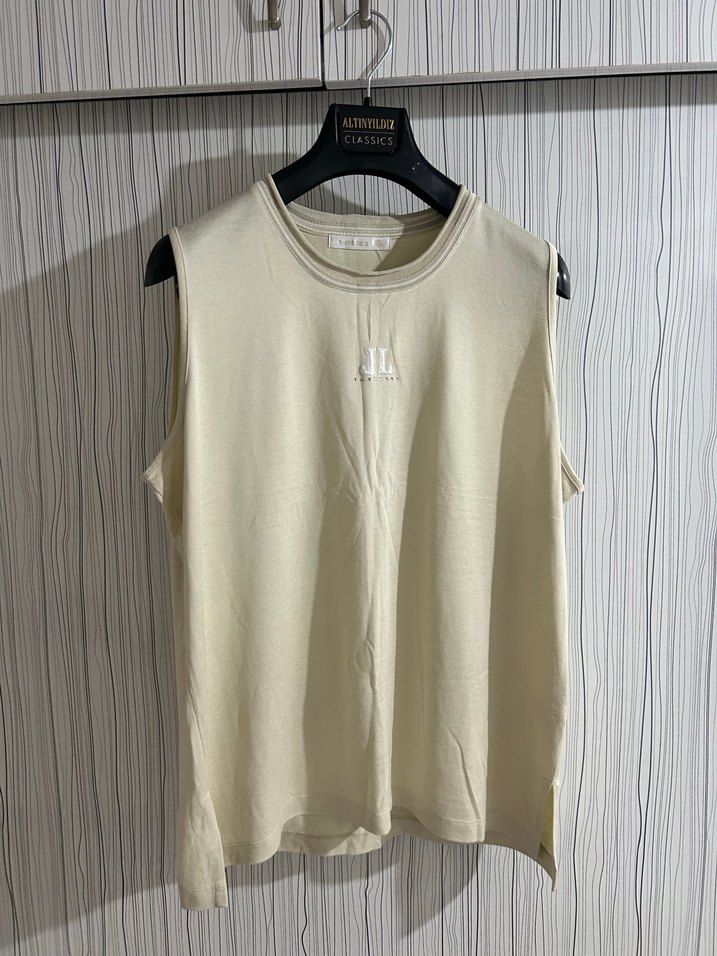 Pamuk kumaştan üretilmiş, bej kolsuz, yuvarlak yakalı ve rahat kesime sahip kısa bluz. Günlük spor şıklığı için idealdir.