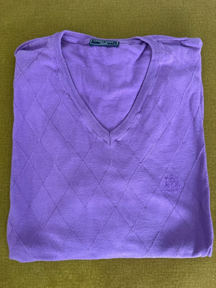 Sabri Özel marka, lila renk, V yaka süveter. Desenli ve şık tasarım.