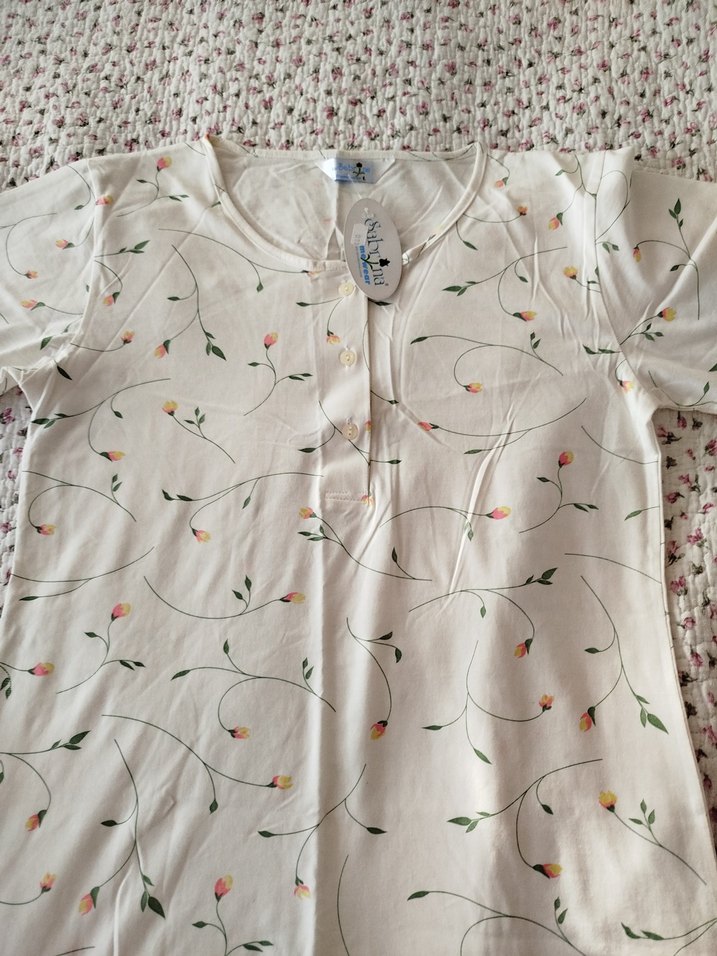 Beyaz zemin üzerine pastel tonlarda çiçek desenli, V yakalı, kısa kollu, bol kesim hamile ve emzirme geceliği. Midi boyda rahat kullanım sağlar.