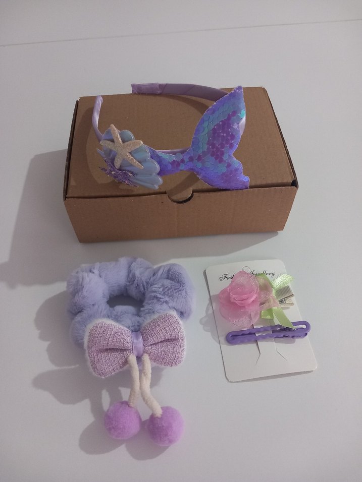 Set içerisinde bir adet denizkızı tacı, bir adet peluş ponponlu sallantılı simit toka ve bir adet gül figürlü toka seti bulunmaktadır. Kutulu ve kutu içerisi talaş kağıtla süslenmiş şekilde gönderilecektir.