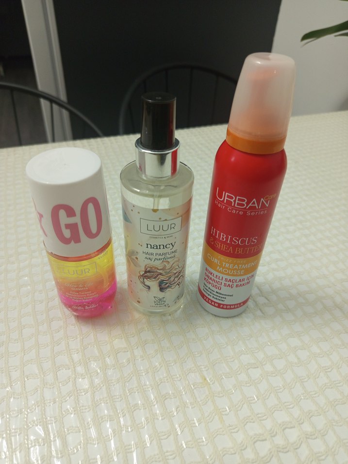 Bu saç bakım seti, şekillendirme ve bakım için sprey, yağ ve köpük içerir. Markalar Urban, Go ve Luur'dur.