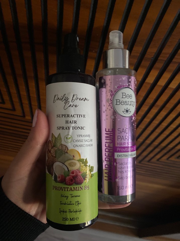 Provitamin B5 içeren iki saç bakım spreyi, saçı korur ve onarır. Biri süperaktif saç spreyi, diğeri sac parfüm spreyi. Hasar görmüş saçlar için besleyici içeriklere sahiptir.