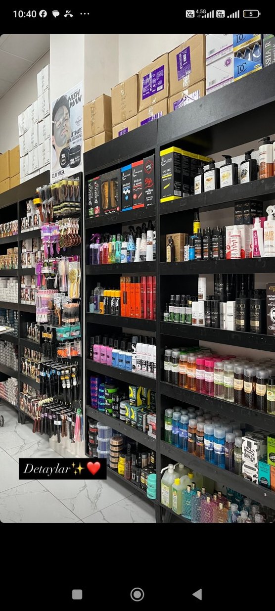 Çeşitli saç spreyi, köpük, jel ve wax ürünleri siyah raflarda düzenli şekilde sergileniyor. Farklı saç şekillendirme ihtiyaçlarına uygun seçenekler mevcut. ✨
