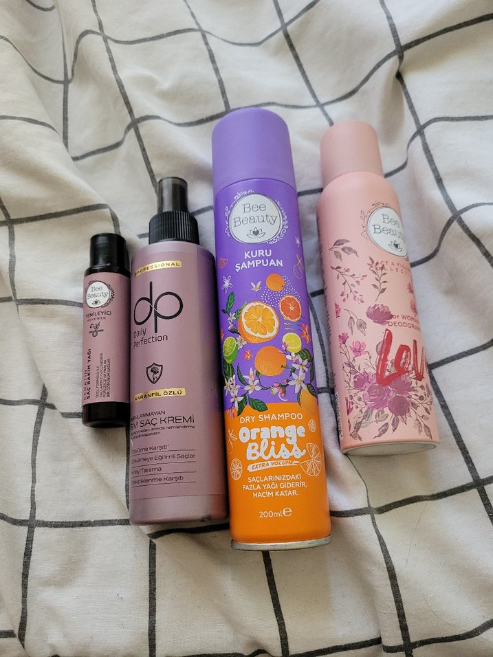 Saç kremi, portakal kokulu kuru şampuan ve deodorant spreylerden oluşan set. Kuru şampuan saçtaki fazla yağı giderir, hacim sağlar.