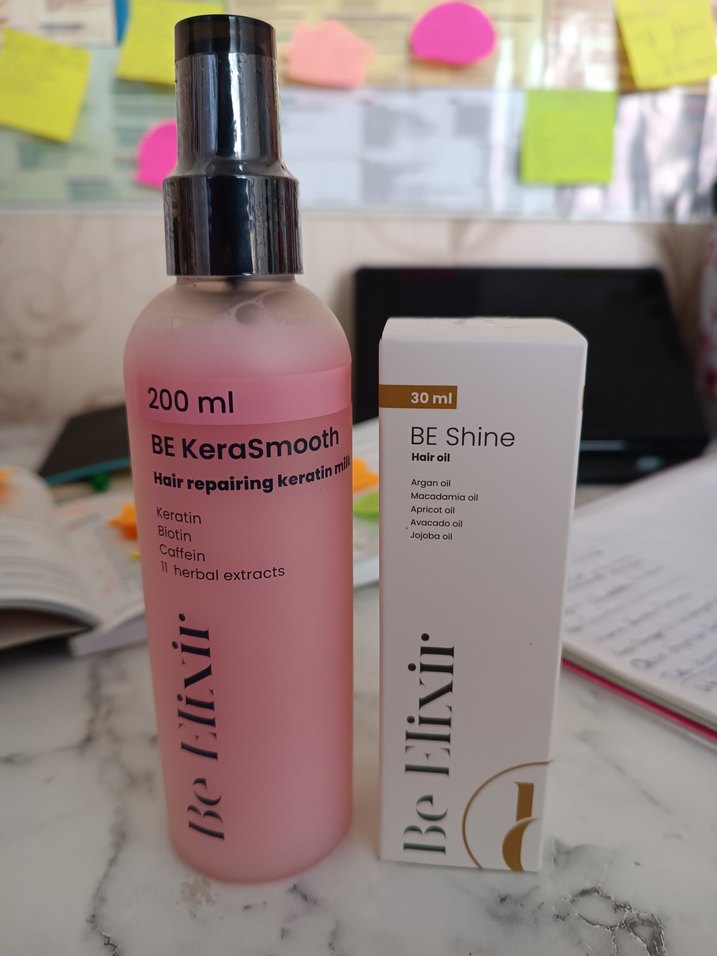 Be Shine Saç Bakım Yağı 30 ml ve Be keraSmooth 200 ml ikisi birlikte satılmaktadır. Be Shine Saç Bakım Yağı, parlaklık, yumuşaklık ve renk canlılığını artırır. Saçı besler, güçlendirir ve onarıma destek olur. Şekillendirme sırasında ısıya karşı koruma sağlar, UV korumasıyla dış etkenlere karşı direnci artırır. Islak veya kuru saç uçlarına uygulanır.
