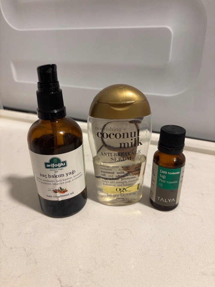 Saç bakım yağı, kırılma önleyici hindistancevizi sütü serumu ve çam terebentin yağı içeren saç sağlığını destekleyen ürünler seti.