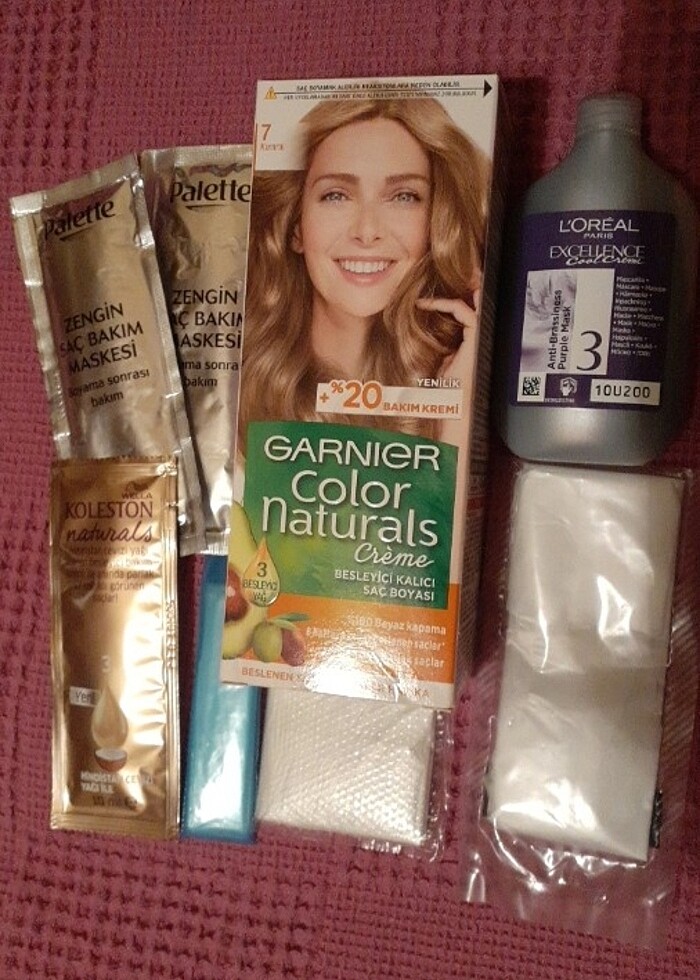 Garnier doğal renkler serisi 7 numara kumral. Yıllar oluyor alalı ancak hiç açılmadı dolayısıyla son kullanma tarihinden etkilenmedi. Yanında turunculaşma karşıtı bakım maskesi, 3 adet boyama sonrası saç bakım kremi ve ekstradan 3 paket eldiven hediye. Toplam fiyat 100 tl.