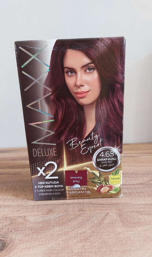 4.65 Şarap Kızı saç boyası, keratin ve argan yağı ile zengin renk ve bakım sağlar. Her kutuda iki tüp krem boya bulunur.