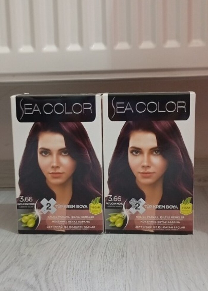 Hiç kullanılmamış 3.66 tonunda patlıcan moru renginde sea color markasına ait saç boyası vegandır.