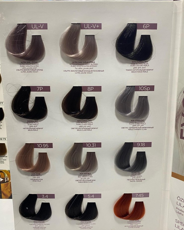 Bu saç boyası renk kartelası ultra violet, siyah, kül ve bakır tonları dahil çeşitli renkleri gösterir.