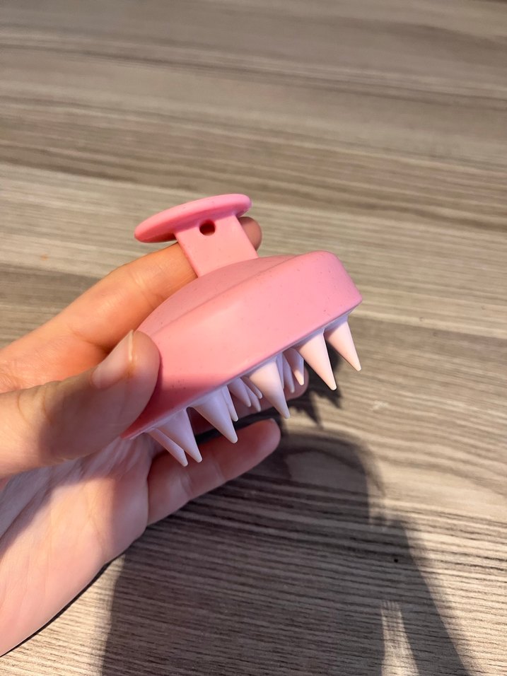 Yumuşak beyaz silikon dişlere sahip pembe saç derisi masaj fırçası, nazik saç derisi uyarımı için tasarlanmıştır. Yuvarlak şekilli ve tutma saplıdır. ♀️
