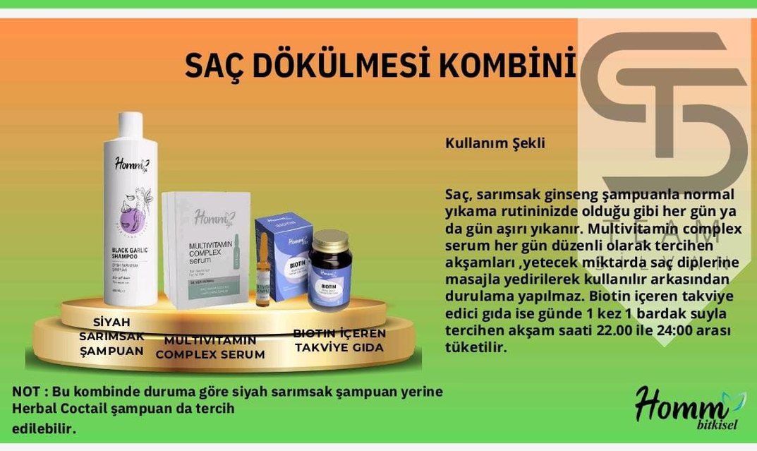 homm bitkisel ürünler Saç dökülmesini önlemek için serum ve biotin takviyesi içeren kombin. Serum günlük, tercihen akşam kullanılır. Takviye gıda yemekle alınır. Siyah sarımsak şampuan yerine tercih edilir. 546....7..7..9...15,,,,,91,,,,