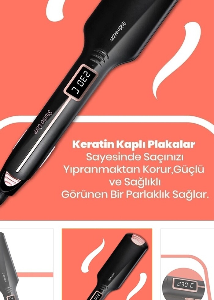 Keratin kaplı plakalar sayesinde saçınızı yıpranmaktan korur, güçlü ve sağlıklı görünen bir parlaklık sağlar. Seramik plakalar ile ısıyı eşit olarak dağıtarak saçlarınızı korur. Turmalin iyon teknolojisi sayesinde elektriklenmeyi önler. Geniş plakaları sayesinde saçınızın tamamını çok daha kısa sürede düzleştirebilirsiniz. Dijital LCD ekranı sayesinde saçınıza uygun sıcaklık seçimini rahatlıkla yapabilirsiniz. 1 saat sonra otomatik kapanma özelliği ile güvenli bir kullanım imkanı sunar. 360° dönebilen hareketli kablosu ile rahatlıkla saçınızı düzleştirebilirsiniz. Seyahat kilidini kullanarak rahatlıkla yanınızda taşıyabilirsiniz. Turmalin , Keratin ve Seramik kaplı plakalar Geniş Plakaları (100x50mm) sayesinde hızlı ve kolay işlem 100-230 derece arası saçınıza uygun sıcaklık ayarı 1,8 metre kauçuk, ısıya dayanıklı kablo 60W Performans 1 saat sonunda otomatik kapanma Seyahat Kilidi