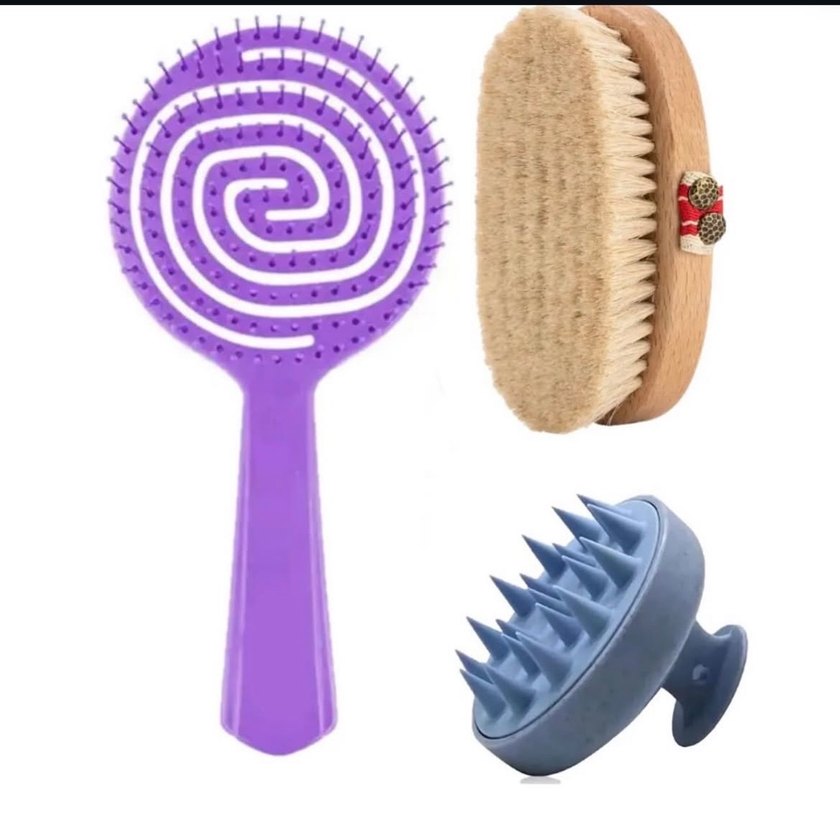 Mor esnek saç fırçası, doğal kıllı ahşap fırça ve mavi silikonlu kafa derisi masaj aleti içeren set. ♀️