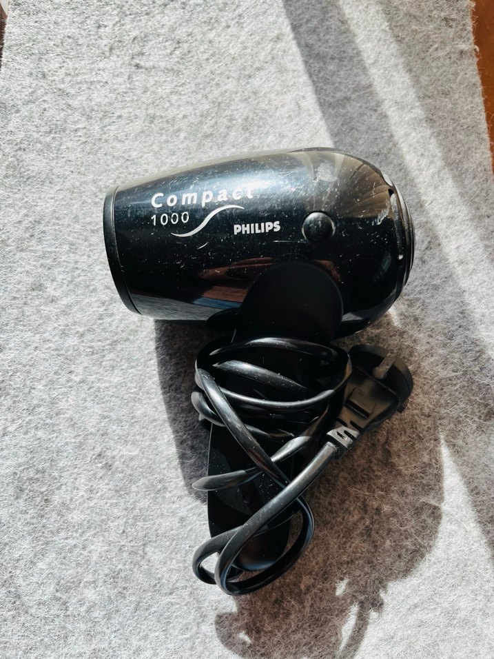 Kompakt tasarımlı siyah saç kurutma makinesi, uzun kablosu ile kolay kullanım sağlar. Philips marka Compact 1000 model. mini portatif yurtta seyahatte kullanım için ideal 2 kademeli saç kurutma makinesi.