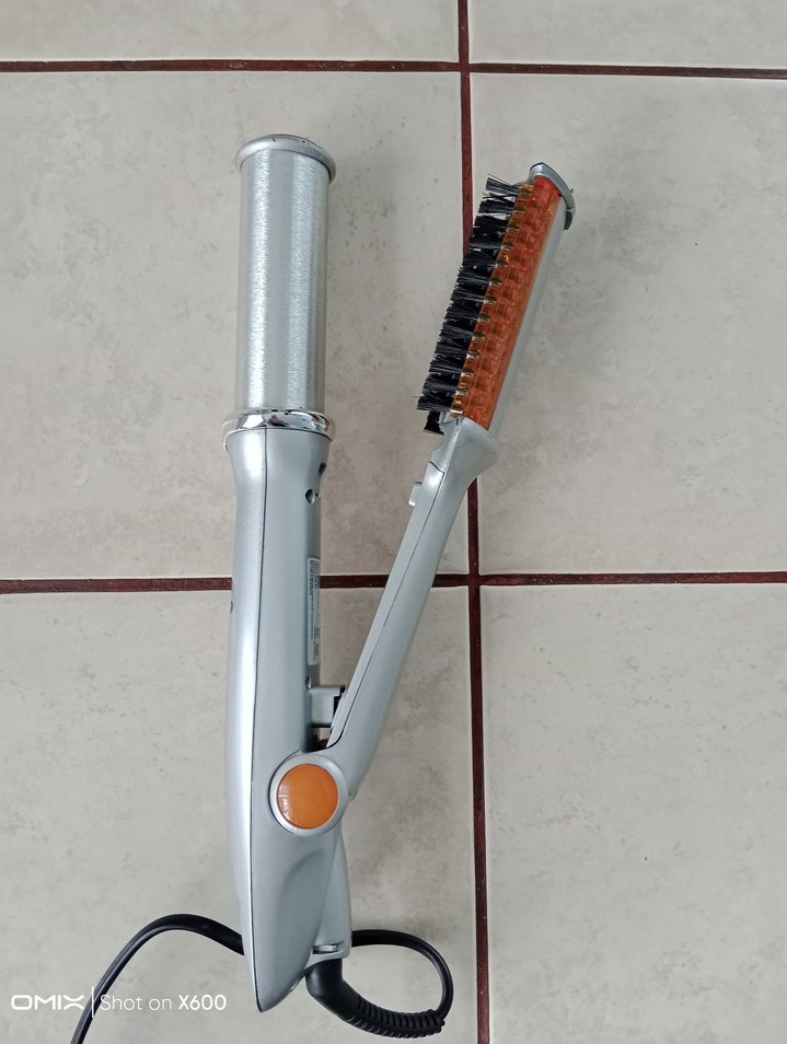 Turuncu düğmeli, fırça başlıklı gri saç şekillendirici, kullanımı kolay ergonomik saplı.
