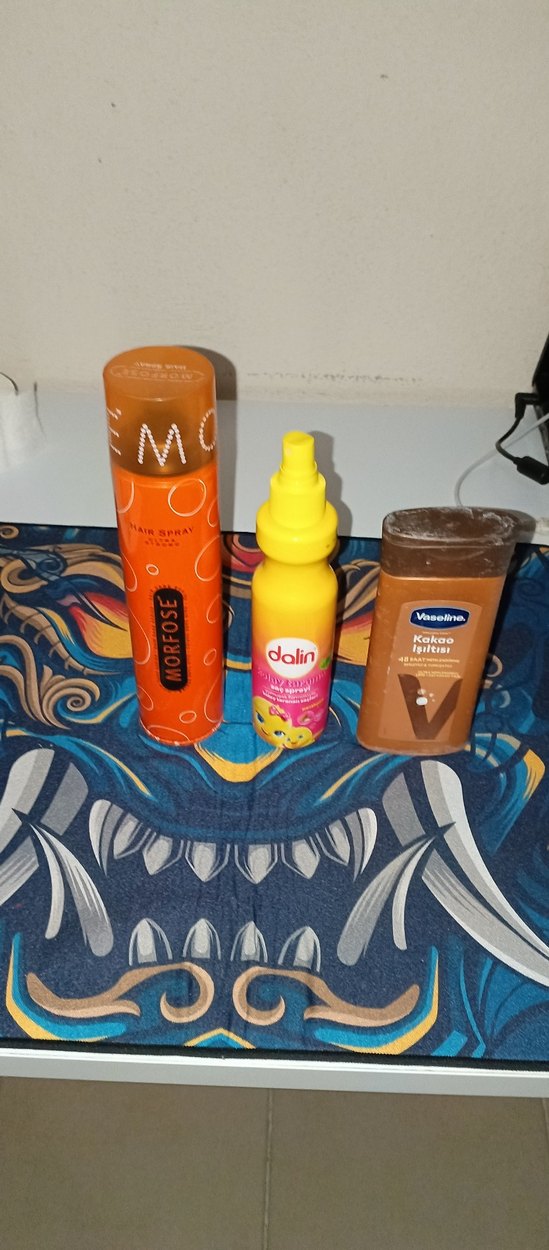Turuncu Morfose saç spreyi ve sarı Dalin saç bakım spreyi ile beraber nemlendirmek için Vaseline kakao yağı stick. Saç şekillendirme ve bakım için uygun.