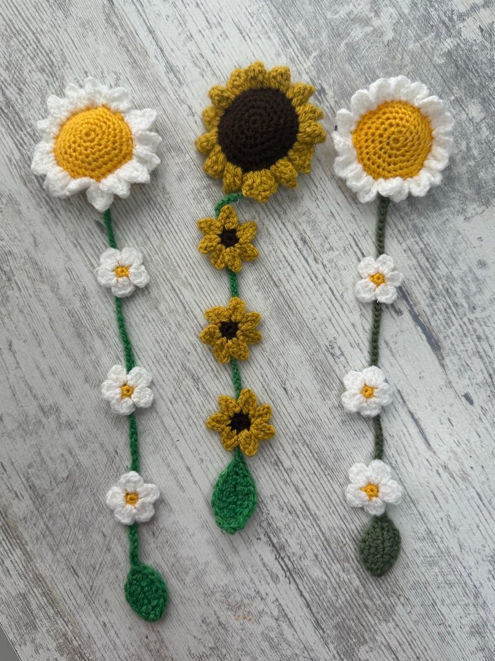 Bohem tarzda el yapımı örgü çiçekler, ayçiçeği ve papatyalar yeşil saplarla. Dekoratif amaçlı kullanılabilir.