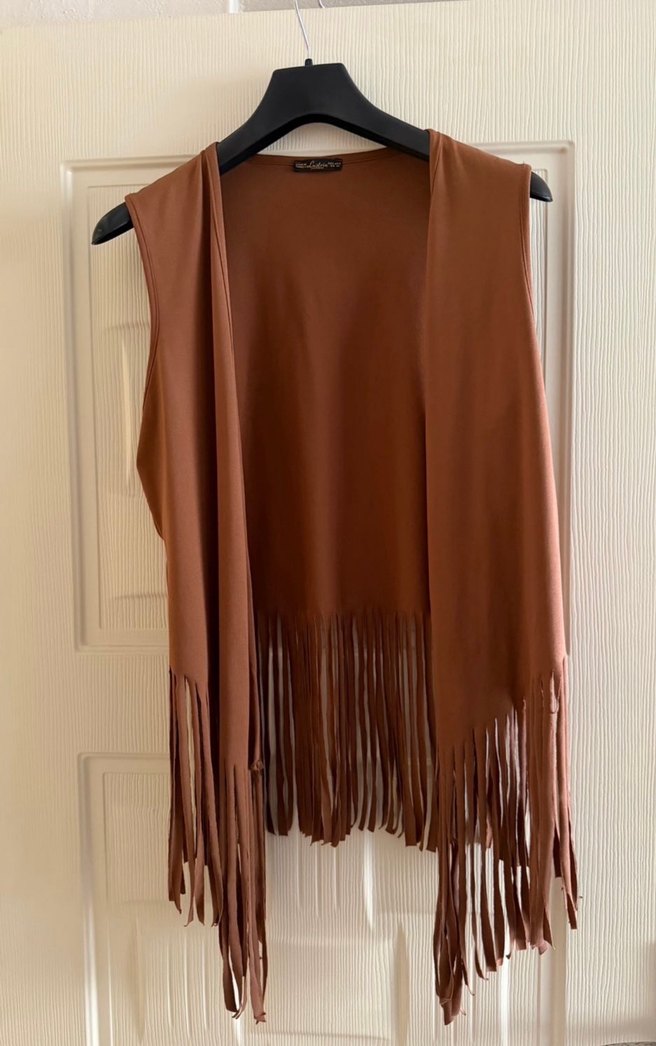 Kahverengi ,kolsuz, saçaklı ve salaş kesim bohem yelek. Askısız yakasıyla rahat bir görünüm sunar.