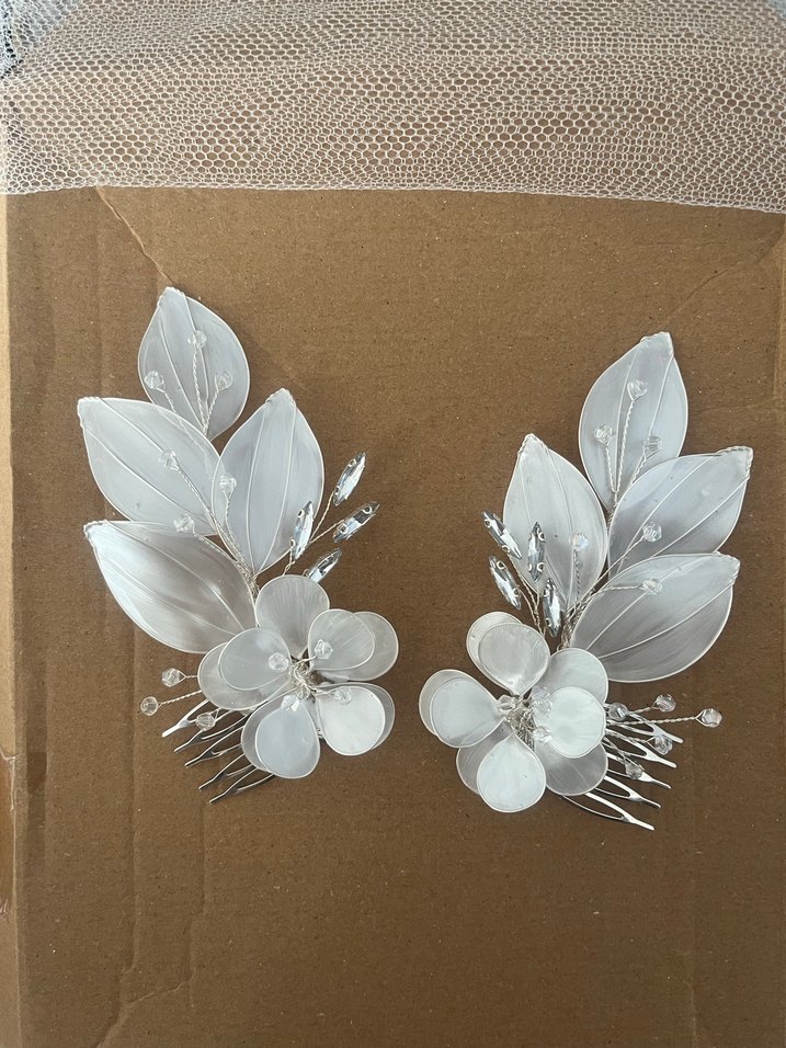 Bu çift beyaz saç tokası, boncuklu cam çiçekler ve yapraklar içerir. Minimalist ve klasik zarafette tasarlanmıştır