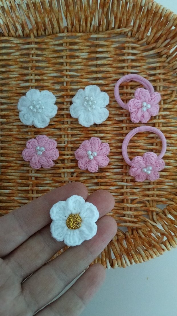 Boncuk detaylı pembe ve beyaz çiçek desenli saç tokaları ve lastikleri, çocuklar için uygun. çift fiyatı 90 TL