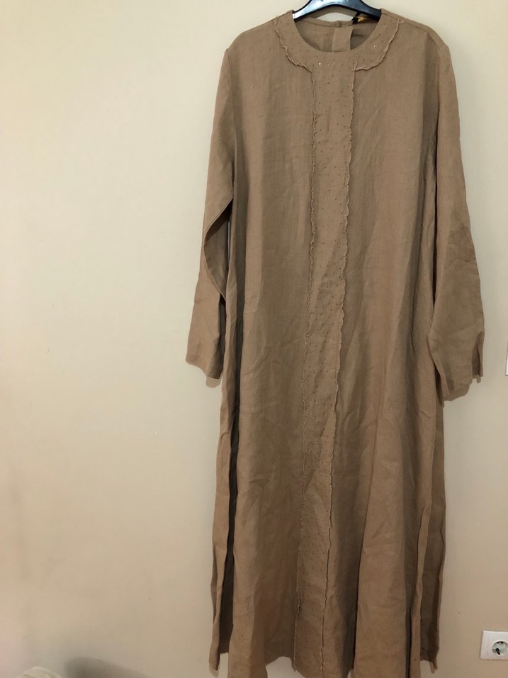 Kumaş Keten licrasız salaş kesim sade Şık ve oldukça rahattıır minik taşlarla süslü keten elbise Namazlık.. çekme yapmaz iç göstermez kumaş Göğüs 112 cm Boy 140 Kolboyu 60