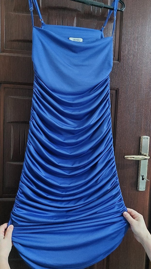 Bu mavi midi abiye elbise, straplez ve ince askılı, drapeli tasarımıyla dikkat çeker. Sade ve şık, parti için ideal bir seçimdir.