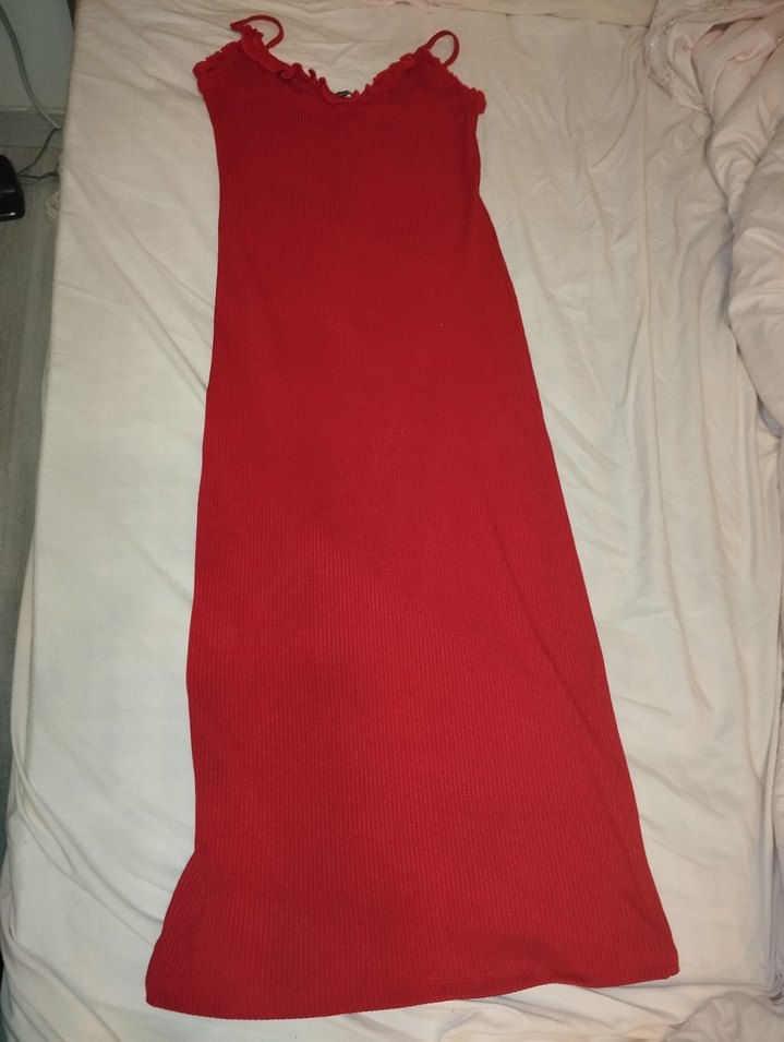 Bu kırmızı uzun elbise, drapeli ve straplez tasarımıyla dikkat çeker. Parlak sentetik kumaştan olup, minimalist ve cesur sokak stili için uygundur. ❤️