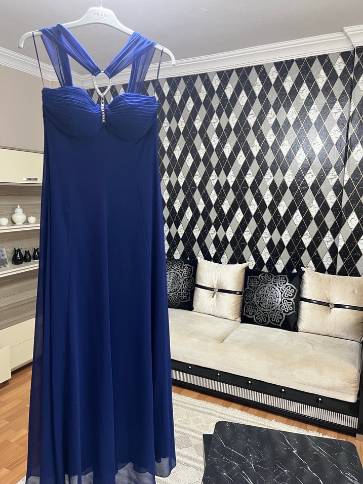 Lacivert uzun abiye elbise, straplez yaka ve drapeli detaylara sahip. İnce askılı, modern klasik tarzda, düğünler için uygun, Paris zarafetini yansıtıyor. Gögüsten etek ucuna kadar 50 cmdir
