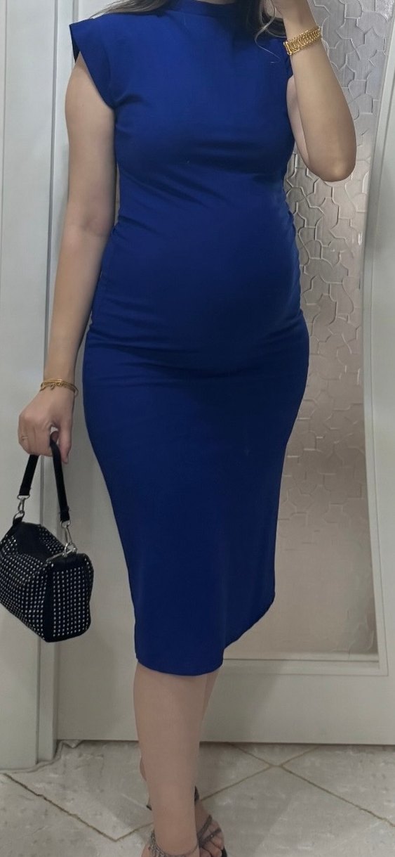 Straplez yaka ve ince askılı, vücuda oturan elbise. Koyu mavi, düz ve yumuşak sentetik kumaştan, günlük sokak stiline uygun.