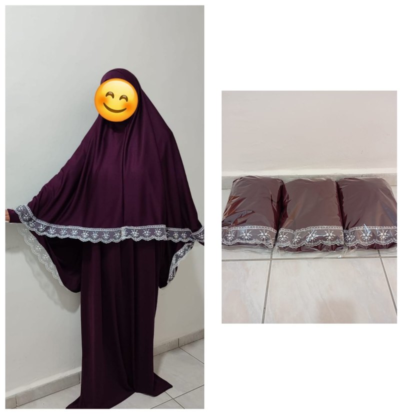Koyu mor renkte, dantelli kenar detaylı, dökümlü tasarıma sahip kadın namazlık elbisesi. Yumuşak sentetik kumaştan üretilmiş, sade ve klasik tarzda.