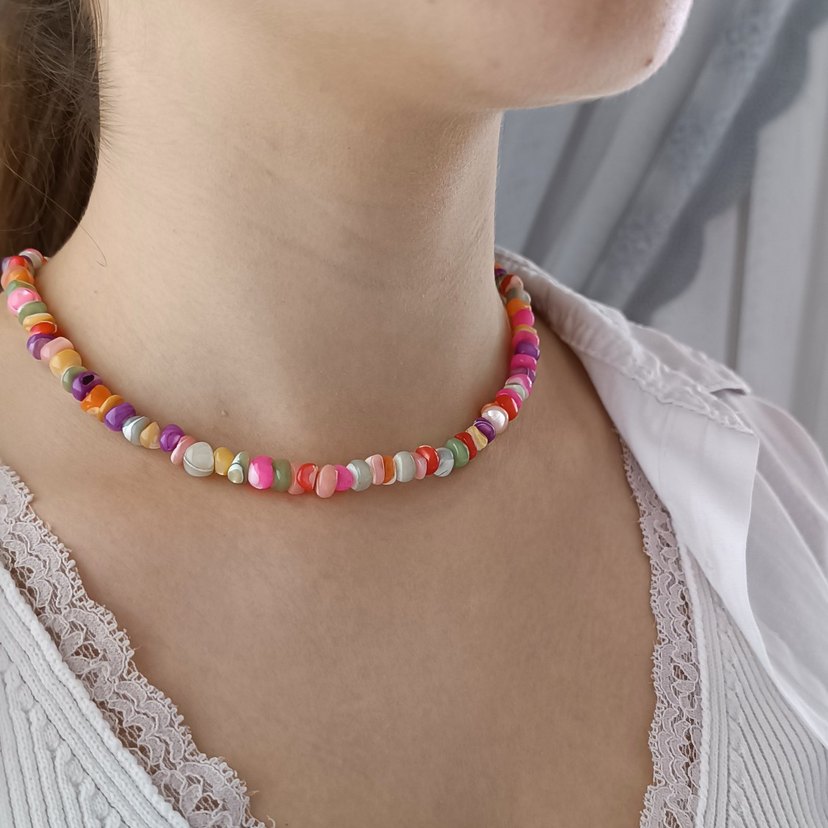 Bohem tarzda, pastel tonlarda tie-dye desenli boncuklardan oluşan normal midi uzunlukta kolye.
