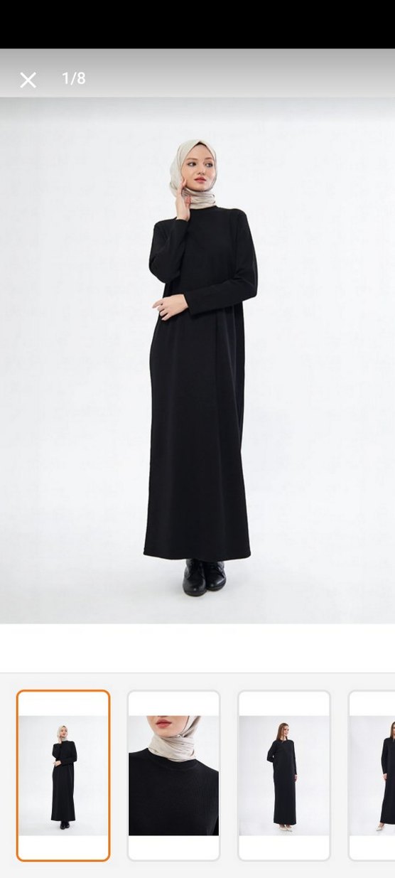 Siyah uzun elbise, yüksek yakalı ve uzun kolludur. Düz, sentetik kumaştan üretilmiş, sade ve rahat kesimlidir. Günlük kullanıma uygundur.
