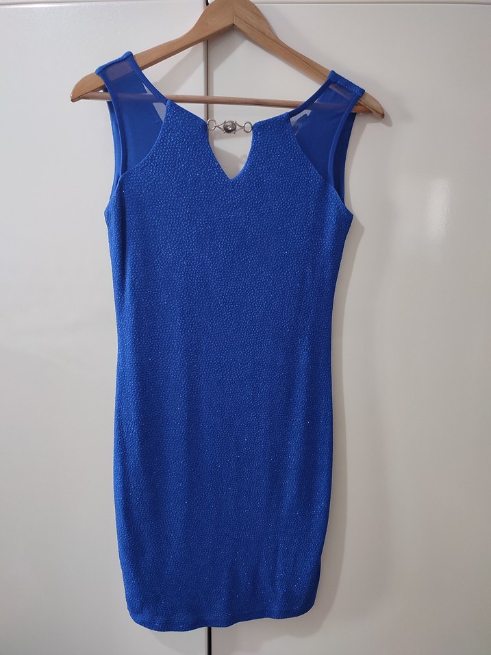 V yakalı, kolsuz, mavi, örme dokulu ve parlak yüzeyli bu mini elbise, sade ve modern bir görünüme sahiptir. Romantik akşamlar için uygundur. Ürün sadece 1 kez kullanıldı