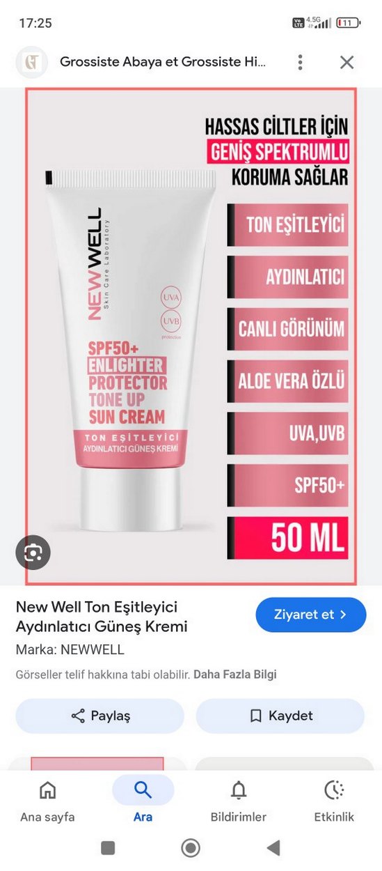 New Well güneş kremi SPF50+ koruma sağlar, ton eşitleyici ve aydınlatıcı etkisi vardır. Aloe vera özü içerir, UVA ve UVB ışınlarına karşı korur.