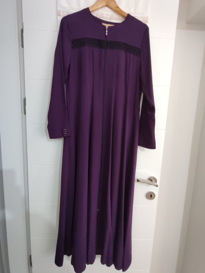 Bu koyu mor uzun elbise, uzun kollu ve salaş kesimlidir. Drapeli tasarıma sahip olup, yumuşak ve sıcak kumaştan üretilmiştir. Günlük ve mütevazı kullanıma uygundur.