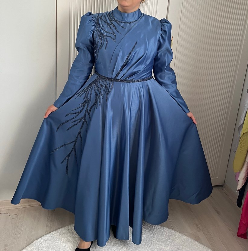 Parlak mavi renkte, uzun kollu ve yüksek yakalı, bol kesim kadın abiye elbise. Drapeli tasarıma ve ince siyah detaylara sahip, düğün için uygun. ✨