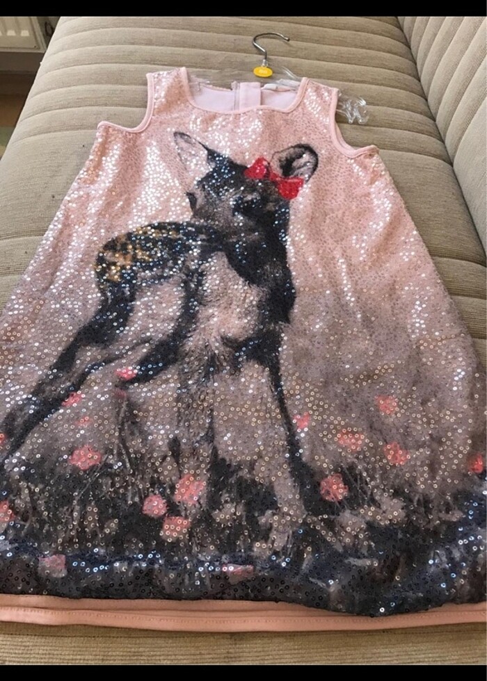 Ön kısmı payetli şirin elbise arka kısmında ufak bi leke var yıpratmamak adına ellemiyorum yıkanınca çıkıcaktır