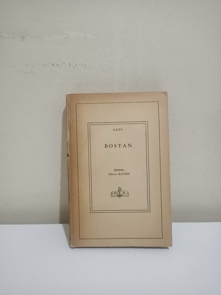 Sadi'nin "Bostan" adlı şiir kitabı, Hikmet Bayur çevirisiyle sade ve klasik kapak tasarımına sahiptir. baskı yılı 1950