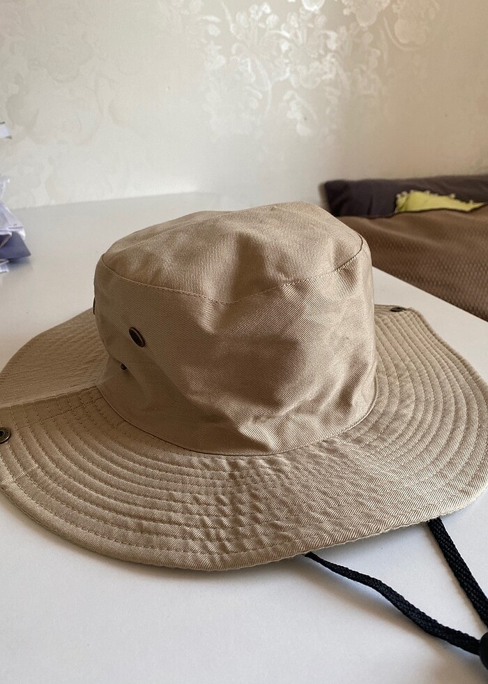 Safari bermuda şapka.Yan taraflarından çıtçıtları vardır.Ürün hiç kullanılmamıştır.İpli ayarlanabilir.Keten şapka.Fötr şapka