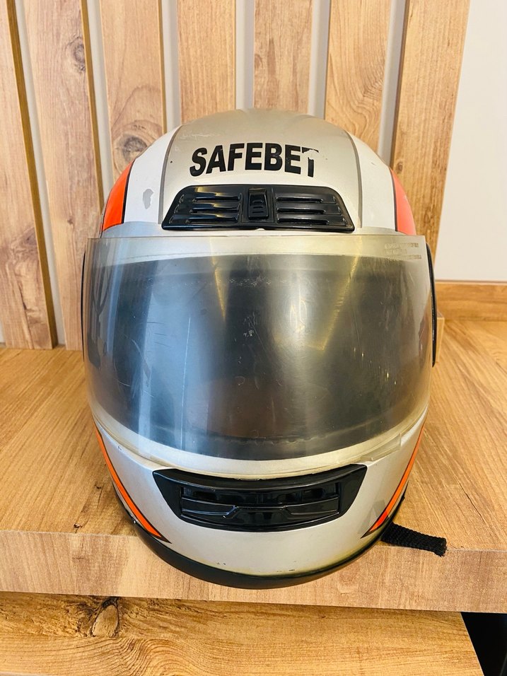 Turuncu ve gri baskılı metal yapıya sahip vintage tarz motosiklet kaskı. Güvenli kullanım için tokalı kayış ve göz koruması sağlayan şeffaf vizör bulunur. Önde "SAFEBET" yazısı yer alır. ️