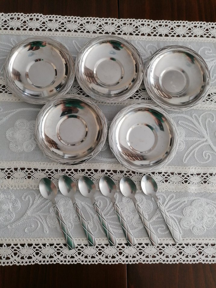 Safir Marka 5 adet çelik çay tabak ve 6 adet çay kaşıktan oluşan set. ☕