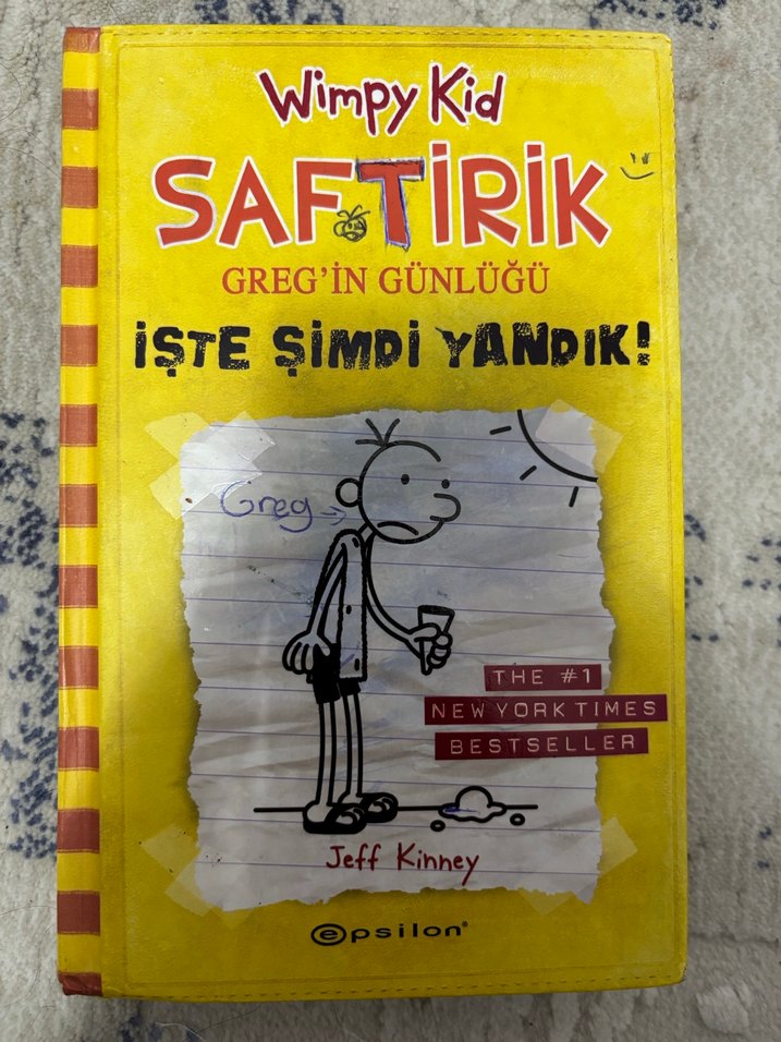 Jeff Kinney'nin "Saftirik Greg'in Günlüğü: İşte Şimdi Yandık!" kitabı, Greg'in günlük hayatından esprili hikayeler sunar ve New York Times çok satanlar arasındadır.