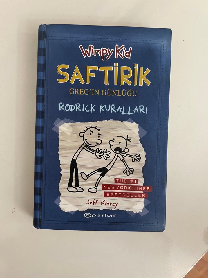 Jeff Kinney'nin yazdığı 'Saftirik Greg'in Günlüğü: Rodrick Kuralları' mizah kitabı, mavi kapaklı ve çizgi roman tarzı çizimlere sahip. New York Times çok satanlar listesinde yer alıyor.