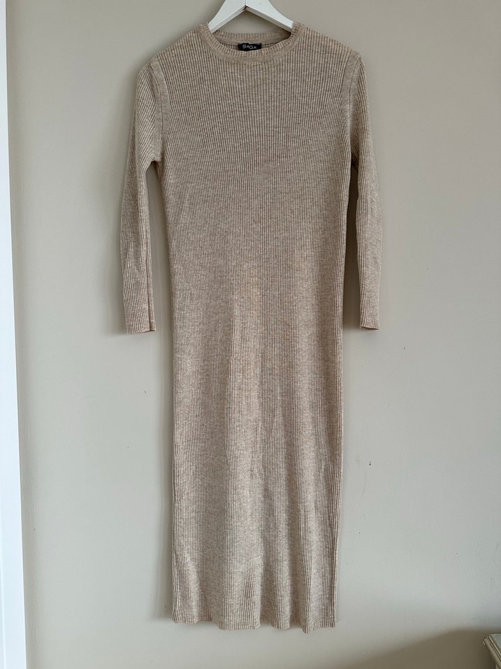 Fitted kesim, uzun kollu bej renkli, triko dokulu keten elbise. Rahat ve gündelik tarz için uygun, yuvarlak yaka detaylıdır. boy 120cm , gogus 40cm esneterek 70cm
